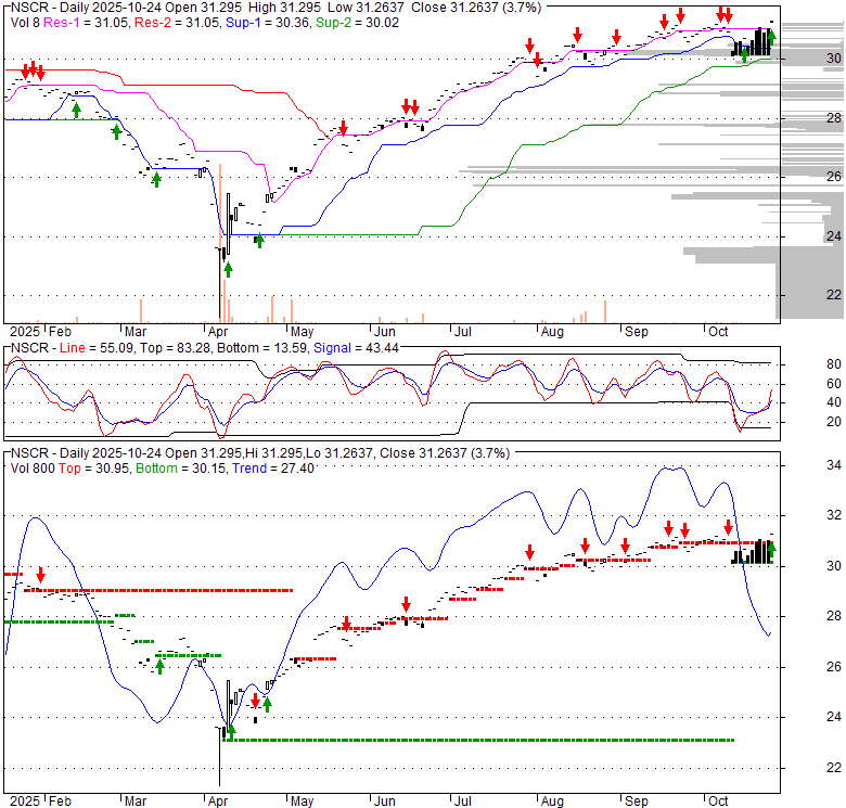 Price has closed below its short-term moving average. Short-term moving average is currently below mid-term; and above long-term moving average. From the relationship between price and moving averages: This stock is NEUTRAL in short-term; and NEUTRAL in mid-long term.[ NSCR ] has closed above bottom band by 30.3%. Bollinger Bands are 51.4% wider than normal. The large width of the bands suggest high volatility as compared to its normal range. The bands have been in this wide range for 4 days. This is a sign that the current trend might continue.