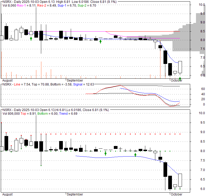 Price has closed above its short-term moving average. Short-term moving average is currently below mid-term; and below long-term moving average. From the relationship between price and moving averages: This stock is NEUTRAL in short-term; and NEUTRAL in mid-long term.[ NSRX ] has closed above bottom band by 23.6%. Bollinger Bands are 0% narrower than normal.