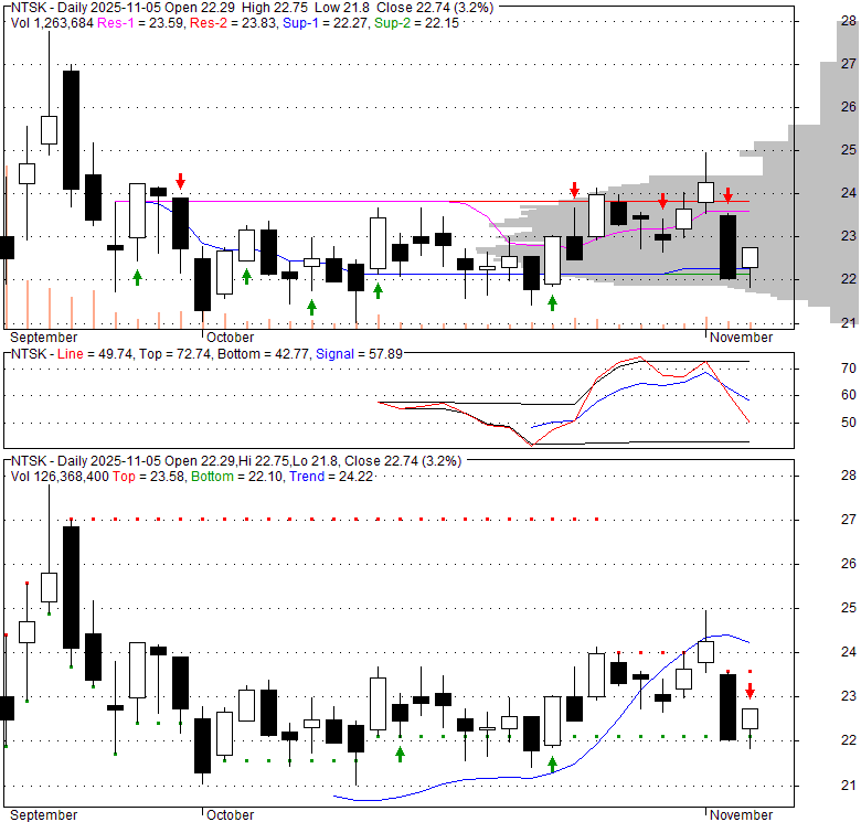 Price has closed below its short-term moving average. Short-term moving average is currently below mid-term; and below long-term moving average. From the relationship between price and moving averages: This stock is NEUTRAL in short-term; and NEUTRAL in mid-long term.[ NTSK ] has closed above bottom band by 44.3%. Bollinger Bands are 0% narrower than normal.
