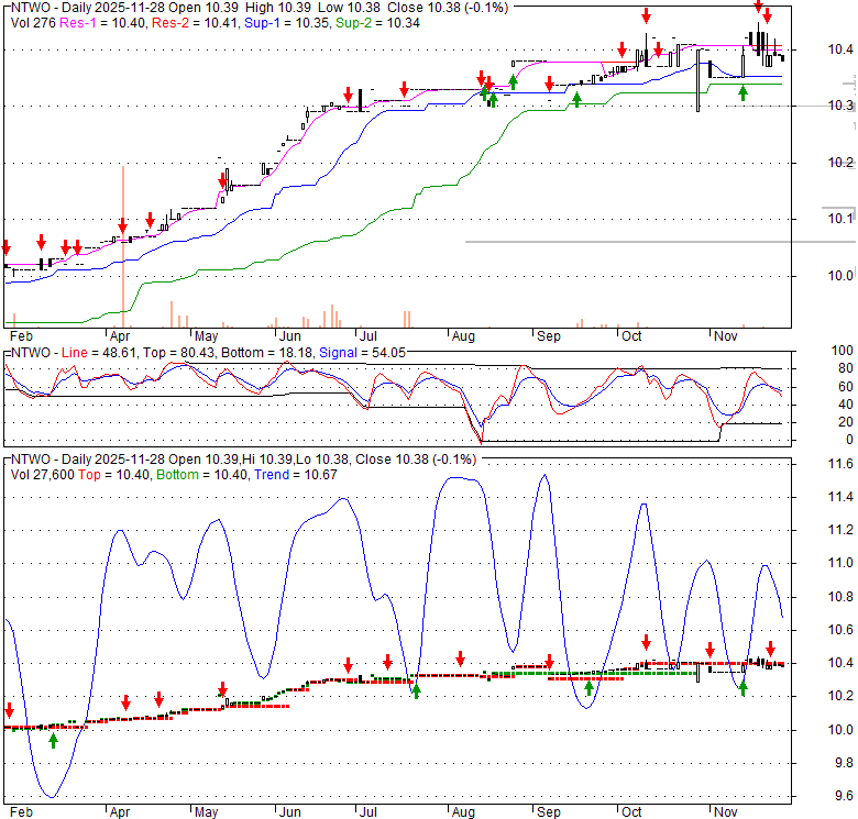Price has closed below its short-term moving average. Short-term moving average is currently above mid-term; and above long-term moving average. From the relationship between price and moving averages: This stock is NEUTRAL in short-term; and BULLISH in mid-long term.[ NTWO ] has closed above bottom band by 46.1%. Bollinger Bands are 26.7% wider than normal. The current width of the bands does not suggest anything about the future direction or movement of prices.