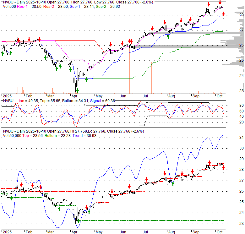 Price has closed below its short-term moving average. Short-term moving average is currently above mid-term; and above long-term moving average. From the relationship between price and moving averages: This stock is NEUTRAL in short-term; and BULLISH in mid-long term.[ NVBU ] has closed below the lower bollinger band by 9.1%. Bollinger Bands are 14% wider than normal. The current width of the bands does not suggest anything about the future direction or movement of prices.