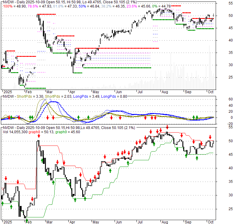 Price has closed above its short-term moving average. Short-term moving average is currently above mid-term; and above long-term moving average. From the relationship between price and moving averages: This stock is BULLISH in short-term; and BULLISH in mid-long term.[ NVDW ] has closed below upper band by 11.9%. Bollinger Bands are 22.3% narrower than normal. The current width of the bands does not suggest anything about the future direction or movement of prices.