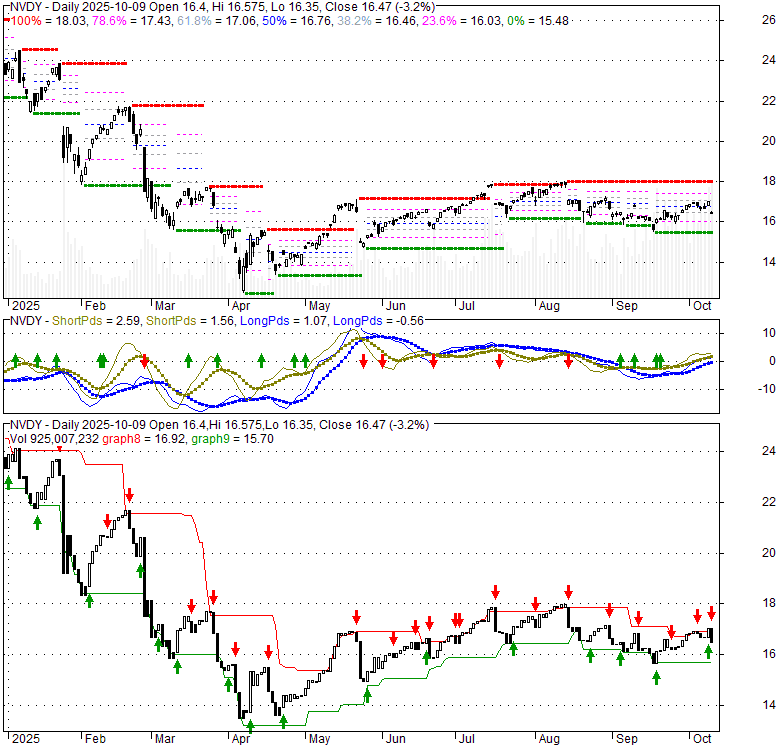 Price has closed below its short-term moving average. Short-term moving average is currently above mid-term; and above long-term moving average. From the relationship between price and moving averages: This stock is NEUTRAL in short-term; and BULLISH in mid-long term.[ NVDY ] has closed above bottom band by 40.6%. Bollinger Bands are 34.2% narrower than normal. The current width of the bands does not suggest anything about the future direction or movement of prices.