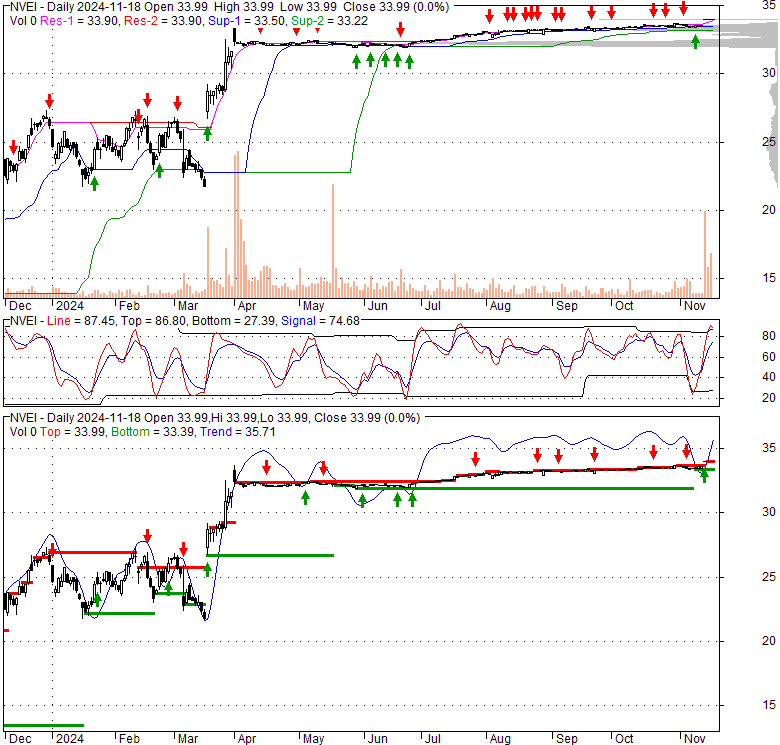 Price has closed above its short-term moving average. Short-term moving average is currently above mid-term; and above long-term moving average. From the relationship between price and moving averages: This stock is BULLISH in short-term; and BULLISH in mid-long term.[ NVEI ] has closed below upper band by 11.2%. Bollinger Bands are 121.6% wider than normal. The large width of the bands suggest high volatility as compared to its normal range. The bands have been in this wide range for 3 days. This is a sign that the current trend might continue.