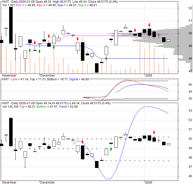 Price has closed below its short-term moving average. Short-term moving average is currently below mid-term; and below long-term moving average. From the relationship between price and moving averages: This stock is NEUTRAL in short-term; and NEUTRAL in mid-long term.[ NVIT ] has closed above bottom band by 44.2%. Bollinger Bands are 0% narrower than normal.