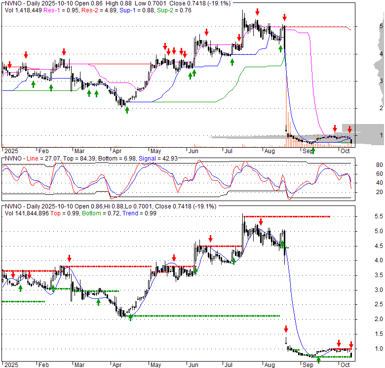 Price has closed below its short-term moving average. Short-term moving average is currently below mid-term; and below long-term moving average. From the relationship between price and moving averages: This stock is BEARISH in short-term; and BEARISH in mid-long term.[ NVNO ] has closed below the lower bollinger band by 36.4%. Bollinger Bands are 85.5% narrower than normal. The narrow width of the bands suggests low volatility as compared to its normal range. The bands have been in this narrow range for 22 bars. This is a sign that the market may be about to initiate a new trend.
