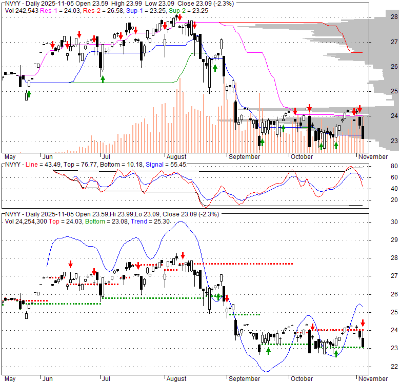 Price has closed below its short-term moving average. Short-term moving average is currently above mid-term; and below long-term moving average. From the relationship between price and moving averages: This stock is NEUTRAL in short-term; and NEUTRAL in mid-long term.[ NVYY ] has closed above bottom band by 12.7%. Bollinger Bands are 19.8% narrower than normal. The current width of the bands does not suggest anything about the future direction or movement of prices.
