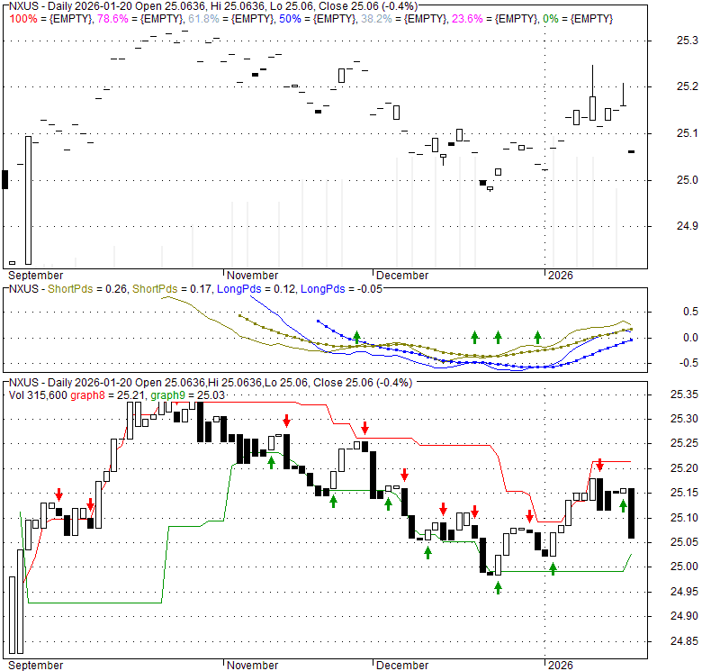 Price has closed below its short-term moving average. Short-term moving average is currently above mid-term; and below long-term moving average. From the relationship between price and moving averages: This stock is NEUTRAL in short-term; and NEUTRAL in mid-long term.[ NXUS ] has closed above bottom band by 25.7%. Bollinger Bands are 0% narrower than normal.