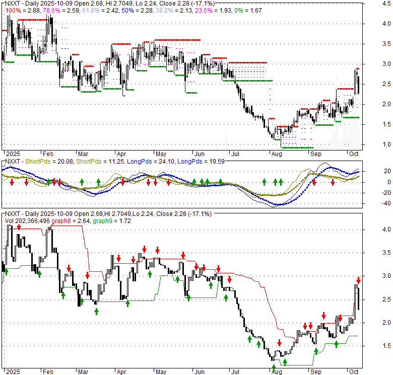 Price has closed below its short-term moving average. Short-term moving average is currently above mid-term; and above long-term moving average. From the relationship between price and moving averages: This stock is NEUTRAL in short-term; and NEUTRAL in mid-long term.[ NXXT ] has closed below upper band by 34.4%. Bollinger Bands are 90.9% wider than normal. The large width of the bands suggest high volatility as compared to its normal range. The bands have been in this wide range for 2 days. This is a sign that the current trend might continue.