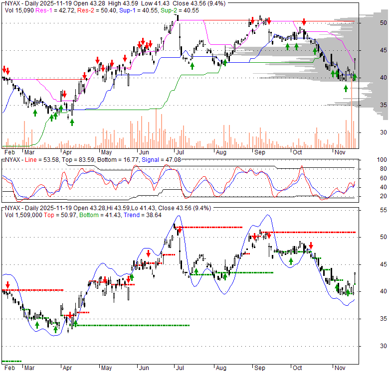 Price has closed above its short-term moving average. Short-term moving average is currently below mid-term; and below long-term moving average. From the relationship between price and moving averages: This stock is NEUTRAL in short-term; and BEARISH in mid-long term.[ NYAX ] has closed below upper band by 3.9%. Bollinger Bands are 27.4% narrower than normal. The current width of the bands does not suggest anything about the future direction or movement of prices.