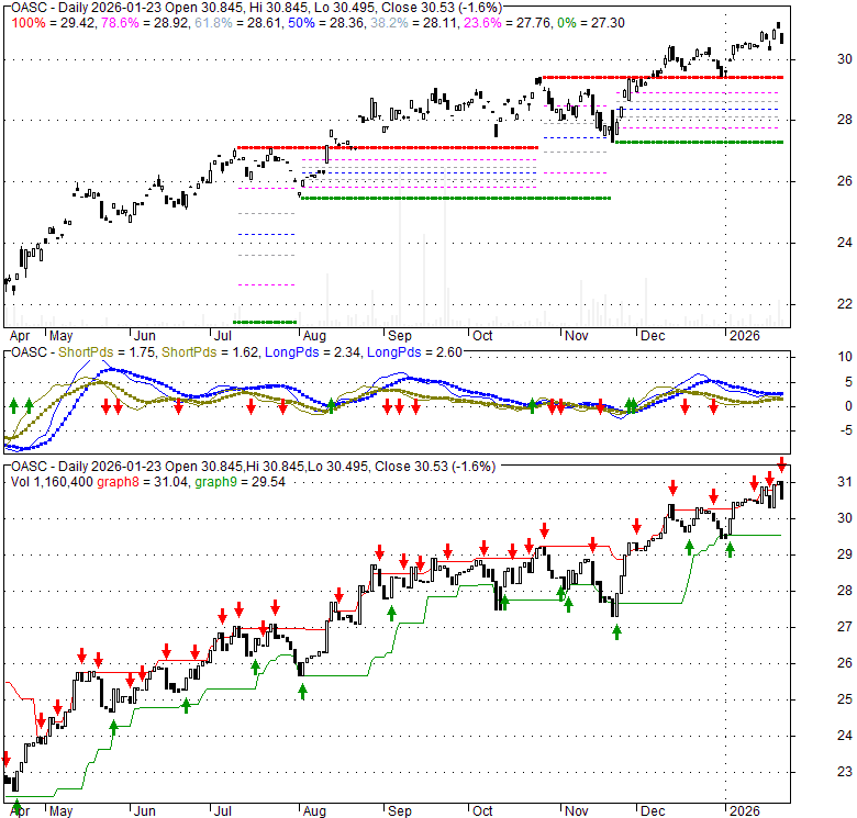 Price has closed below its short-term moving average. Short-term moving average is currently above mid-term; and above long-term moving average. From the relationship between price and moving averages: This stock is NEUTRAL in short-term; and BULLISH in mid-long term.[ OASC ] has closed below upper band by 46.1%. Bollinger Bands are 7.5% narrower than normal. The current width of the bands does not suggest anything about the future direction or movement of prices.