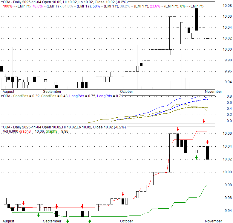 Price has closed below its short-term moving average. Short-term moving average is currently above mid-term; and below long-term moving average. From the relationship between price and moving averages: This stock is NEUTRAL in short-term; and NEUTRAL in mid-long term.[ OBA ] has closed above bottom band by 38.9%. Bollinger Bands are 0% narrower than normal.