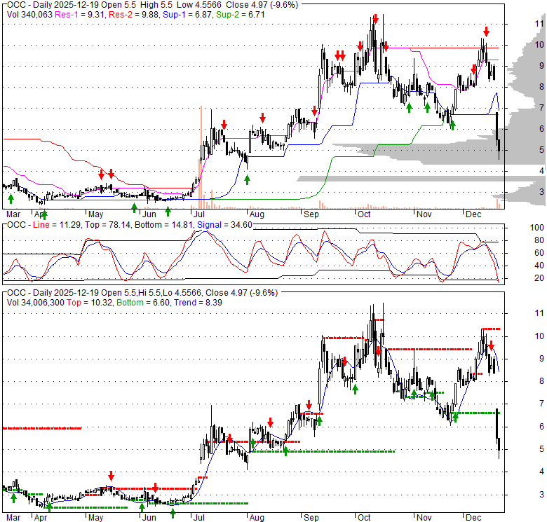 Price has closed below its short-term moving average. Short-term moving average is currently below mid-term; and below long-term moving average. From the relationship between price and moving averages: This stock is BEARISH in short-term; and NEUTRAL in mid-long term.[ OCC ] has closed below the lower bollinger band by 11.9%. Although price has broken the lower band and a downside breakout is possible; the most likely direction for [ OCC ] is to continue within current trading range. It is unclear right now based on current values. 89.9% wider than normal. The large width of the bands suggest high volatility as compared to its normal range. The bands have been in this wide range for 1 days. This is a sign that the current trend might continue.