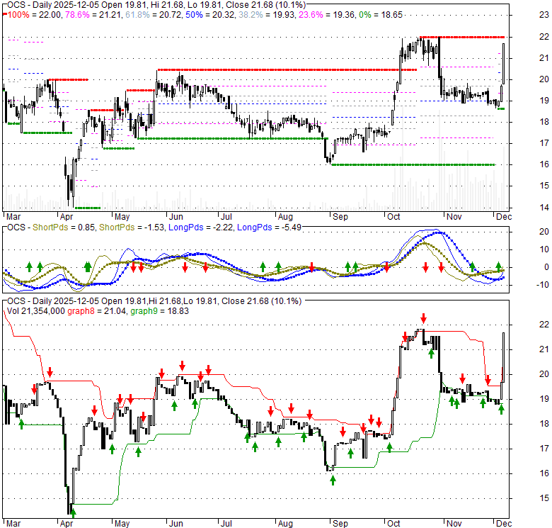 Price has closed below its short-term moving average. Short-term moving average is currently above mid-term; and above long-term moving average. From the relationship between price and moving averages: This stock is NEUTRAL in short-term; and BULLISH in mid-long term.[ OCS ] has closed above bottom band by 19.1%. Bollinger Bands are 93.7% wider than normal. The large width of the bands suggest high volatility as compared to its normal range. The bands have been in this wide range for 4 days. This is a sign that the current trend might continue.