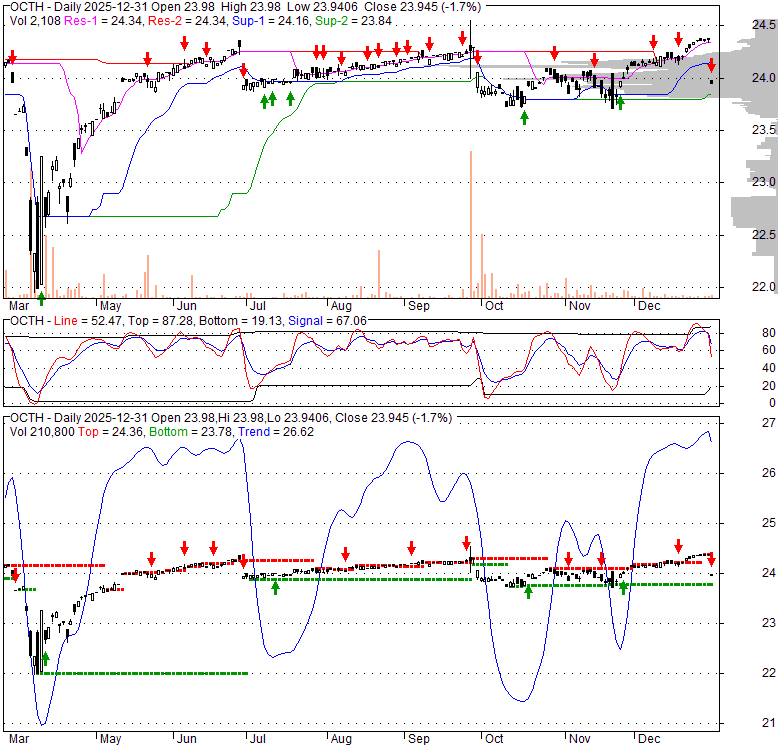 Price has closed below its short-term moving average. Short-term moving average is currently above mid-term; and above long-term moving average. From the relationship between price and moving averages: This stock is NEUTRAL in short-term; and BULLISH in mid-long term.[ OCTH ] has closed below the lower bollinger band by 19.3%. Bollinger Bands are 44.4% wider than normal. The large width of the bands suggest high volatility as compared to its normal range. The bands have been in this wide range for 0 days. This is a sign that the current trend might continue.