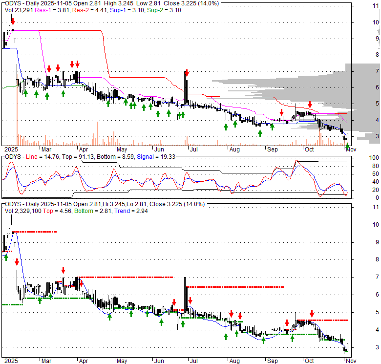 Price has closed above its short-term moving average. Short-term moving average is currently below mid-term; and below long-term moving average. From the relationship between price and moving averages: This stock is NEUTRAL in short-term; and BEARISH in mid-long term.[ ODYS ] has closed above bottom band by 34.2%. Bollinger Bands are 10.4% wider than normal. The current width of the bands does not suggest anything about the future direction or movement of prices.