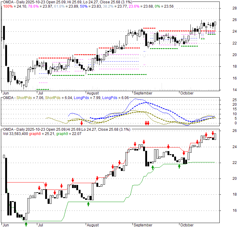 Price has closed above its short-term moving average. Short-term moving average is currently above mid-term; and below long-term moving average. From the relationship between price and moving averages: This stock is BULLISH in short-term; and NEUTRAL in mid-long term.[ OMDA ] has closed below upper band by 22.6%. Bollinger Bands are 0% narrower than normal.