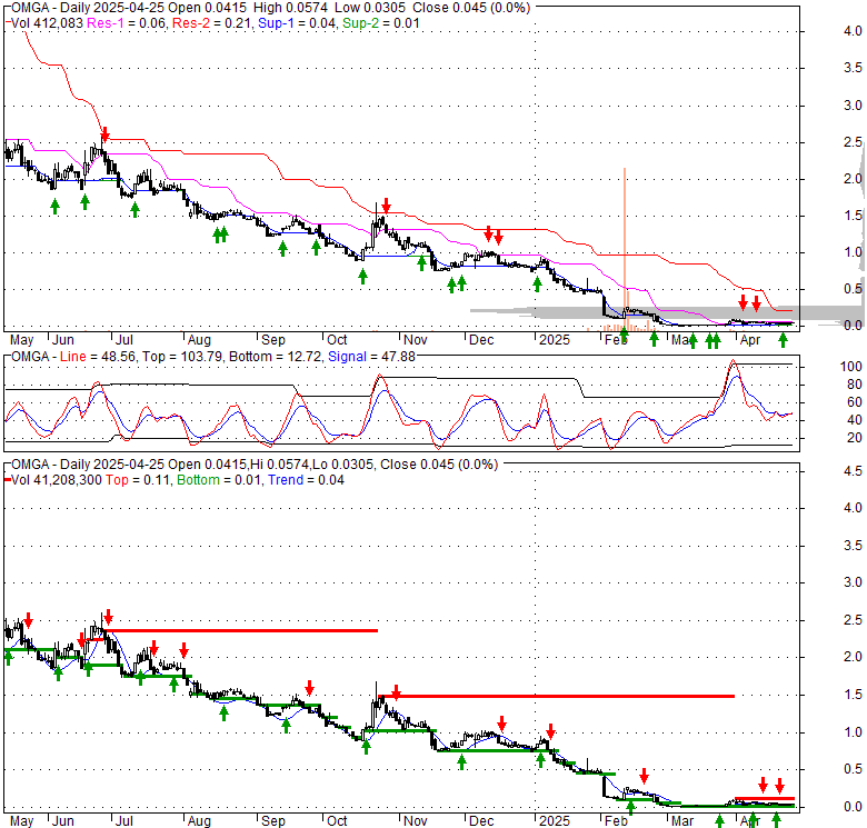 Price has closed above its short-term moving average. Short-term moving average is currently above mid-term; and below long-term moving average. From the relationship between price and moving averages: This stock is BULLISH in short-term; and NEUTRAL in mid-long term.[ OMGA ] has closed above bottom band by 45.8%. Bollinger Bands are 86% narrower than normal. The narrow width of the bands suggests low volatility as compared to its normal range. The bands have been in this narrow range for 31 bars. This is a sign that the market may be about to initiate a new trend.
