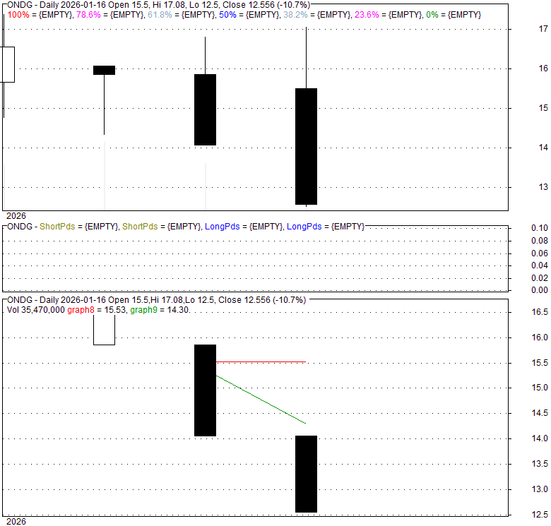 Price has closed below its short-term moving average. Short-term moving average is currently below mid-term; and below long-term moving average. From the relationship between price and moving averages: This stock is NEUTRAL in short-term; and NEUTRAL in mid-long term.[ ONDG ] has closed Bollinger Bands are 0% narrower than normal.