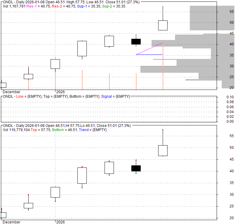 Price has closed above its short-term moving average. Short-term moving average is currently below mid-term; and below long-term moving average. From the relationship between price and moving averages: This stock is NEUTRAL in short-term; and NEUTRAL in mid-long term.[ ONDL ] has closed Bollinger Bands are 0% narrower than normal.