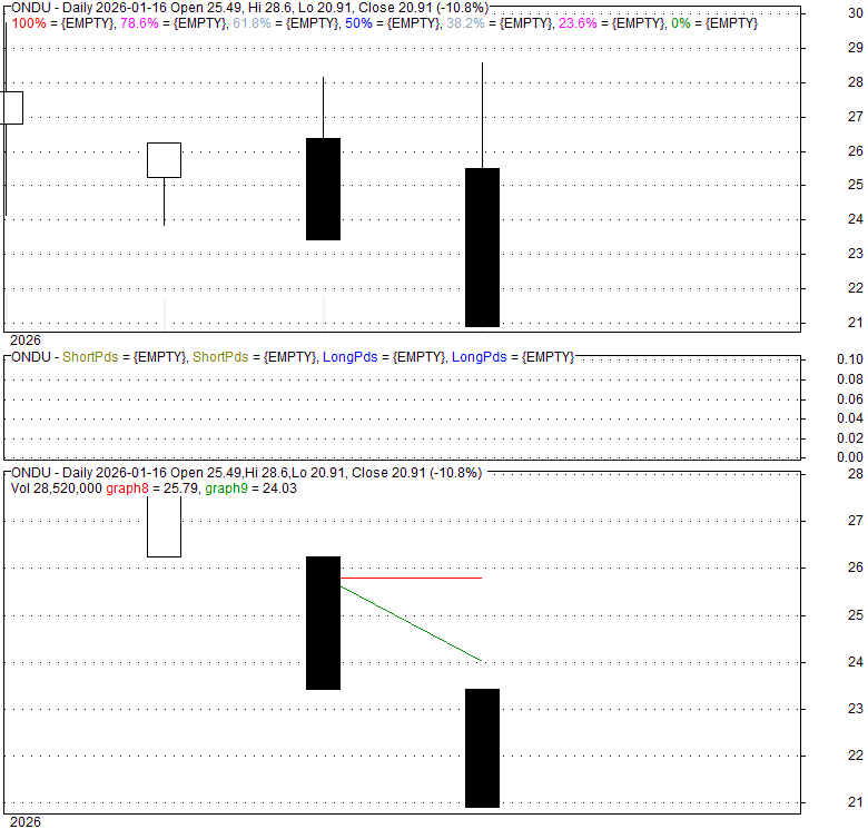 Price has closed below its short-term moving average. Short-term moving average is currently below mid-term; and below long-term moving average. From the relationship between price and moving averages: This stock is NEUTRAL in short-term; and NEUTRAL in mid-long term.[ ONDU ] has closed Bollinger Bands are 0% narrower than normal.