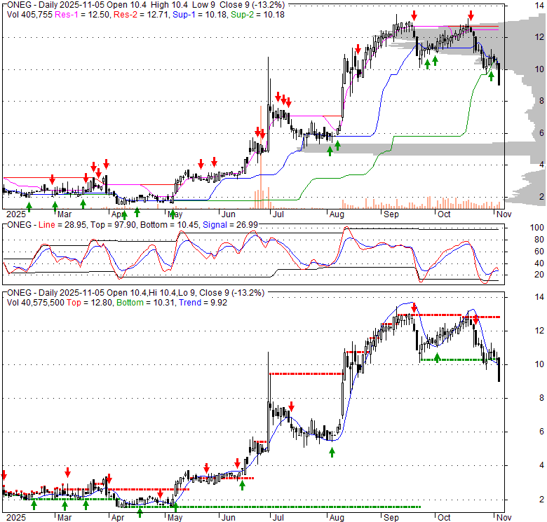 Price has closed below its short-term moving average. Short-term moving average is currently below mid-term; and above long-term moving average. From the relationship between price and moving averages: This stock is BEARISH in short-term; and NEUTRAL in mid-long term.[ ONEG ] has closed below the lower bollinger band by 0.6%. If price is in a downtrend band; this downward trend might continue. However a short term pullback inside the band is likely. Bollinger Bands are 30.6% wider than normal. The current width of the bands does not suggest anything about the future direction or movement of prices.