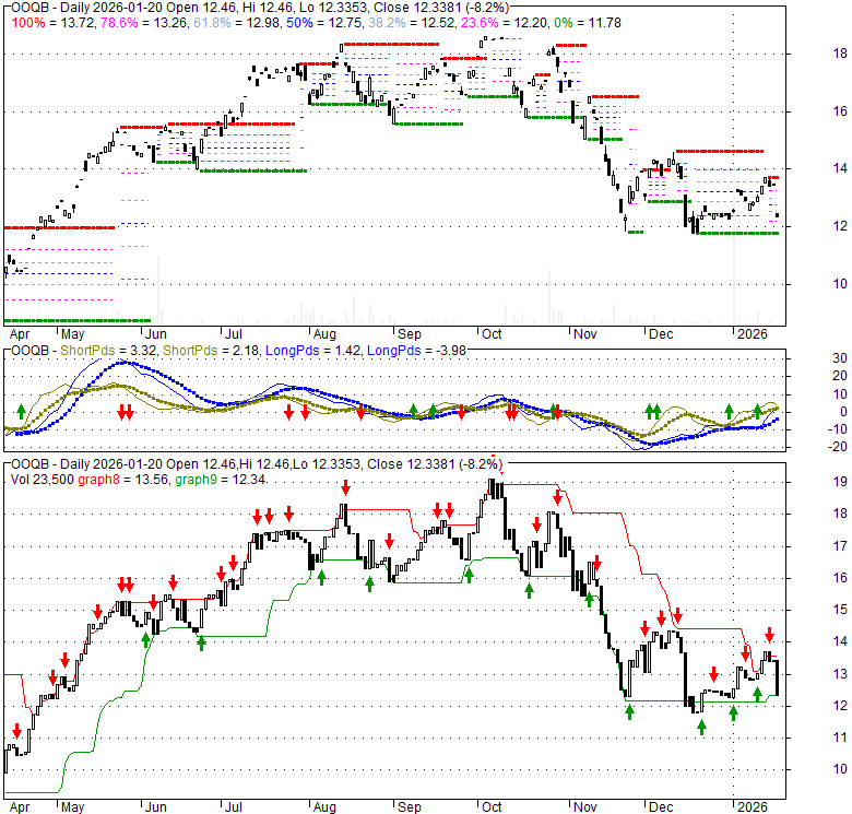 Price has closed below its short-term moving average. Short-term moving average is currently above mid-term; and below long-term moving average. From the relationship between price and moving averages: This stock is NEUTRAL in short-term; and NEUTRAL in mid-long term.[ OOQB ] has closed above bottom band by 17.8%. Bollinger Bands are 36.7% narrower than normal. The current width of the bands does not suggest anything about the future direction or movement of prices.