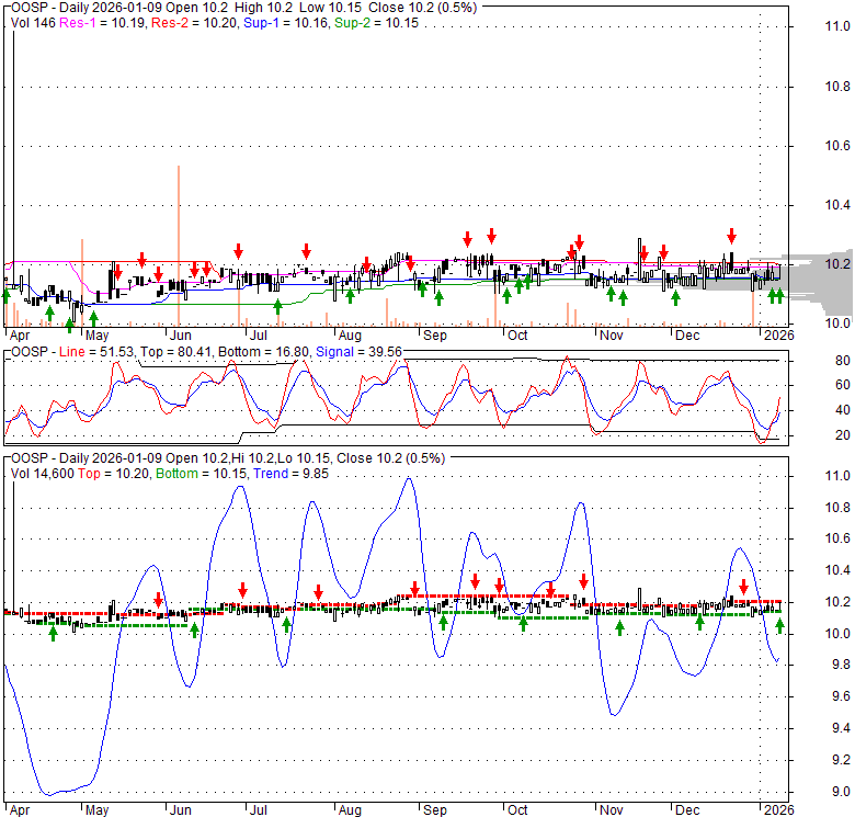 Price has closed above its short-term moving average. Short-term moving average is currently below mid-term; and below long-term moving average. From the relationship between price and moving averages: This stock is NEUTRAL in short-term; and BEARISH in mid-long term.[ OOSP ] has closed below upper band by 22.8%. Bollinger Bands are 13.6% narrower than normal. The current width of the bands does not suggest anything about the future direction or movement of prices.