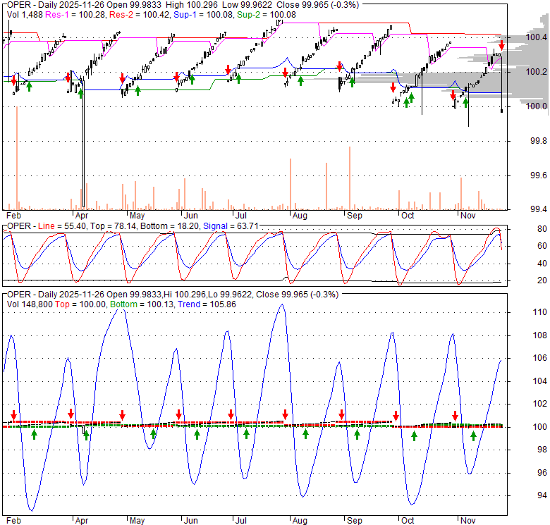 Price has closed below its short-term moving average. Short-term moving average is currently above mid-term; and below long-term moving average. From the relationship between price and moving averages: This stock is NEUTRAL in short-term; and NEUTRAL in mid-long term.[ OPER ] has closed below the lower bollinger band by 9.3%. If price is in a downtrend band; this downward trend might continue. However a short term pullback inside the band is likely. Bollinger Bands are 13.3% narrower than normal. The current width of the bands does not suggest anything about the future direction or movement of prices.