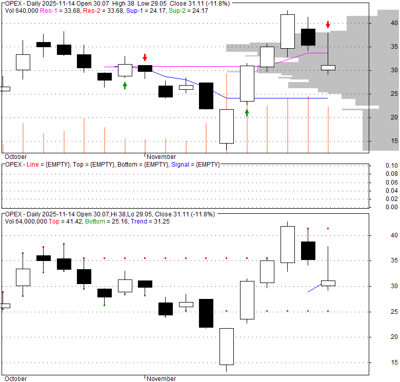 Price has closed below its short-term moving average. Short-term moving average is currently below mid-term; and below long-term moving average. From the relationship between price and moving averages: This stock is NEUTRAL in short-term; and NEUTRAL in mid-long term.[ OPEX ] has closed below upper band by 46.9%. Bollinger Bands are 0% narrower than normal.