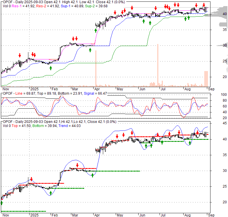 Price has closed above its short-term moving average. Short-term moving average is currently above mid-term; and above long-term moving average. From the relationship between price and moving averages: This stock is BULLISH in short-term; and BULLISH in mid-long term.[ OPOF ] has closed below upper band by 24.8%. Bollinger Bands are 29.7% narrower than normal. The current width of the bands does not suggest anything about the future direction or movement of prices.