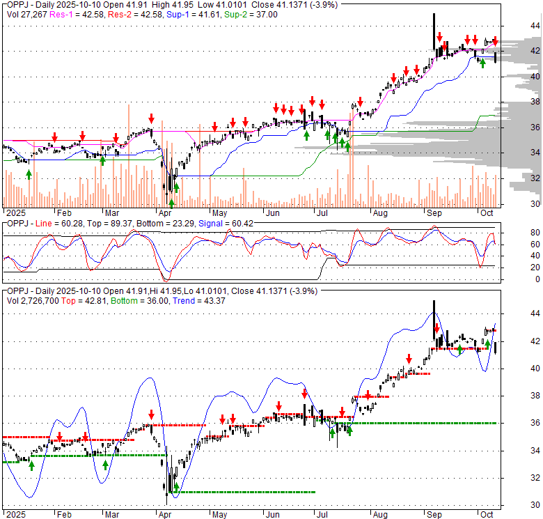 Price has closed below its short-term moving average. Short-term moving average is currently above mid-term; and above long-term moving average. From the relationship between price and moving averages: This stock is NEUTRAL in short-term; and BULLISH in mid-long term.[ OPPJ ] has closed above bottom band by 4.8%. Bollinger Bands are 12% wider than normal. The current width of the bands does not suggest anything about the future direction or movement of prices.