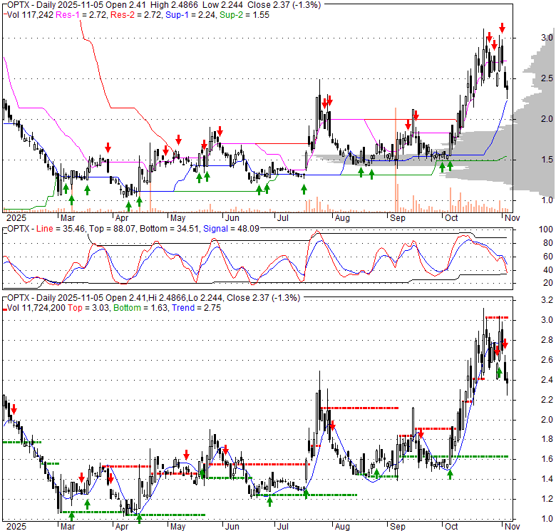 Price has closed below its short-term moving average. Short-term moving average is currently above mid-term; and above long-term moving average. From the relationship between price and moving averages: This stock is NEUTRAL in short-term; and BULLISH in mid-long term.[ OPTX ] has closed above bottom band by 18.8%. Bollinger Bands are 15.7% wider than normal. The current width of the bands does not suggest anything about the future direction or movement of prices.