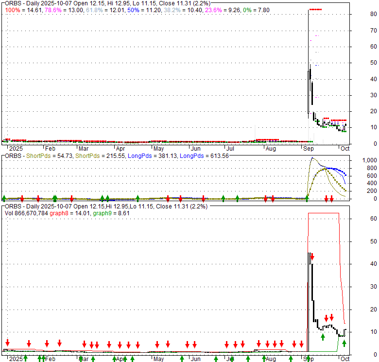 Price has closed above its short-term moving average. Short-term moving average is currently above mid-term; and above long-term moving average. From the relationship between price and moving averages: This stock is BULLISH in short-term; and BULLISH in mid-long term.[ ORBS ] has closed below upper band by 46.0%. Bollinger Bands are 23.7% narrower than normal. The current width of the bands does not suggest anything about the future direction or movement of prices.