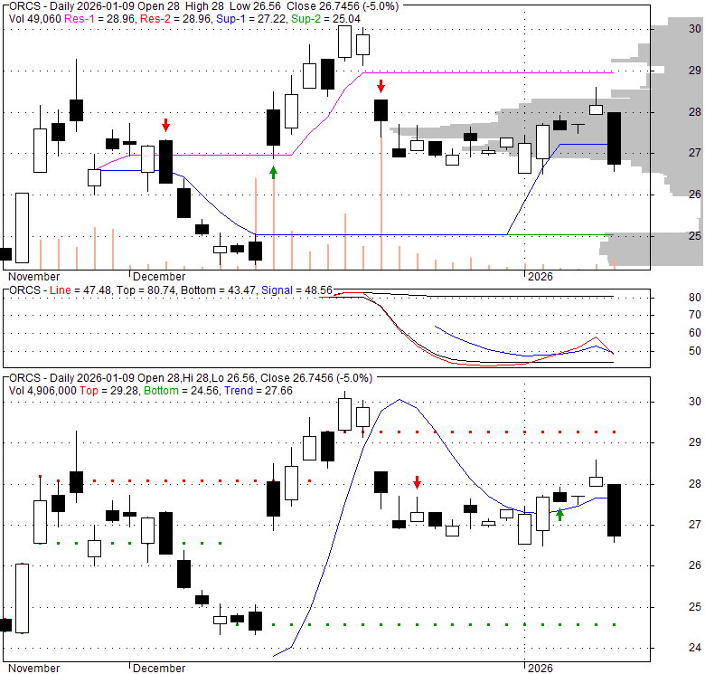 Price has closed below its short-term moving average. Short-term moving average is currently below mid-term; and below long-term moving average. From the relationship between price and moving averages: This stock is NEUTRAL in short-term; and NEUTRAL in mid-long term.[ ORCS ] has closed above bottom band by 23.6%. Bollinger Bands are 0% narrower than normal.