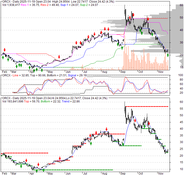 Price has closed above its short-term moving average. Short-term moving average is currently below mid-term; and below long-term moving average. From the relationship between price and moving averages: This stock is NEUTRAL in short-term; and NEUTRAL in mid-long term.[ ORCX ] has closed above bottom band by 28.0%. Bollinger Bands are 0.9% narrower than normal. The current width of the bands does not suggest anything about the future direction or movement of prices.