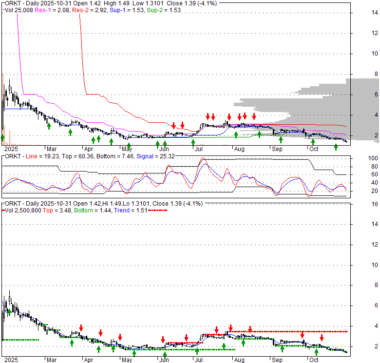 Price has closed below its short-term moving average. Short-term moving average is currently below mid-term; and below long-term moving average. From the relationship between price and moving averages: This stock is BEARISH in short-term; and BEARISH in mid-long term.[ ORKT ] has closed below the lower bollinger band by 2.6%. If price is in a downtrend band; this downward trend might continue. However a short term pullback inside the band is likely. Bollinger Bands are 20.9% narrower than normal. The current width of the bands does not suggest anything about the future direction or movement of prices.