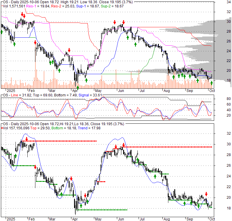 Price has closed above its short-term moving average. Short-term moving average is currently below mid-term; and below long-term moving average. From the relationship between price and moving averages: This stock is NEUTRAL in short-term; and BEARISH in mid-long term.[ OS ] has closed above bottom band by 48.1%. Bollinger Bands are 32.7% narrower than normal. The current width of the bands does not suggest anything about the future direction or movement of prices.