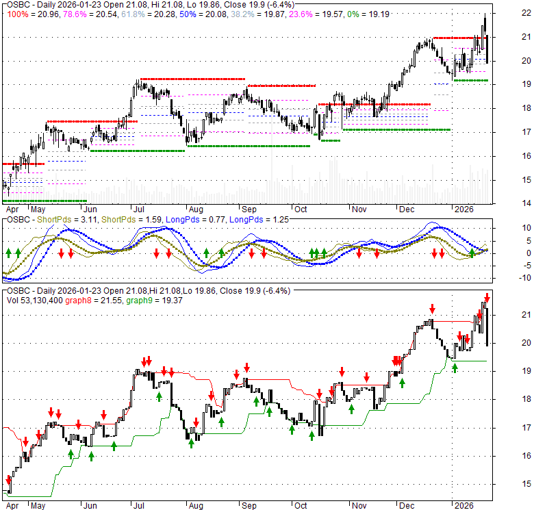 Price has closed below its short-term moving average. Short-term moving average is currently above mid-term; and above long-term moving average. From the relationship between price and moving averages: This stock is NEUTRAL in short-term; and BULLISH in mid-long term.[ OSBC ] has closed above bottom band by 34.6%. Bollinger Bands are 46.8% wider than normal. The large width of the bands suggest high volatility as compared to its normal range. The bands have been in this wide range for 2 days. This is a sign that the current trend might continue.