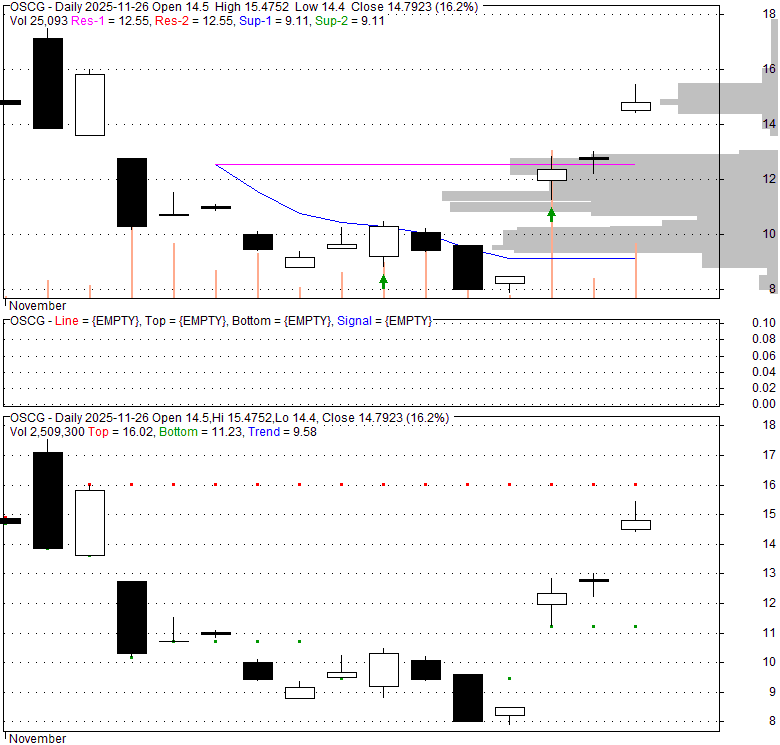 Price has closed above its short-term moving average. Short-term moving average is currently below mid-term; and below long-term moving average. From the relationship between price and moving averages: This stock is NEUTRAL in short-term; and NEUTRAL in mid-long term.[ OSCG ] has closed below upper band by 8.9%. Bollinger Bands are 0% narrower than normal.