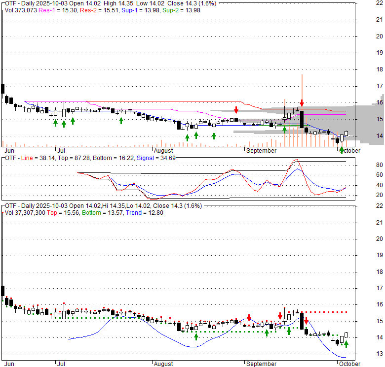 Price has closed above its short-term moving average. Short-term moving average is currently below mid-term; and below long-term moving average. From the relationship between price and moving averages: This stock is NEUTRAL in short-term; and NEUTRAL in mid-long term.[ OTF ] has closed above bottom band by 42.7%. Bollinger Bands are 0% narrower than normal.