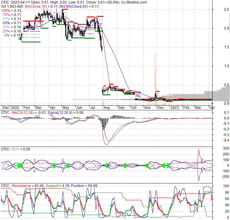 Price has closed below its short-term moving average. Short-term moving average is currently below mid-term; and below long-term moving average. From the relationship between price and moving averages: This stock is BEARISH in short-term; and BEARISH in mid-long term.[ OTIC ] has closed below the lower bollinger band by 43.2%. Although price has broken the lower band and a downside breakout is possible; the most likely direction for [ OTIC ] is to continue within current trading range. It is unclear right now based on current values. 122.9% wider than normal. The large width of the bands suggest high volatility as compared to its normal range. The bands have been in this wide range for 0 days. This is a sign that the current trend might continue.