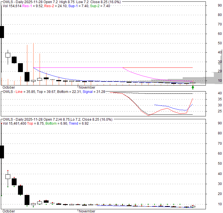 Price has closed above its short-term moving average. Short-term moving average is currently below mid-term; and below long-term moving average. From the relationship between price and moving averages: This stock is NEUTRAL in short-term; and NEUTRAL in mid-long term.[ OWLS ] has closed below upper band by 43.5%. Bollinger Bands are 0% narrower than normal.
