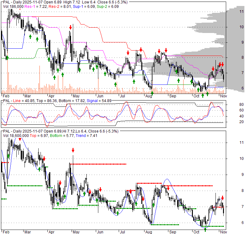 Price has closed below its short-term moving average. Short-term moving average is currently above mid-term; and below long-term moving average. From the relationship between price and moving averages: This stock is NEUTRAL in short-term; and NEUTRAL in mid-long term.[ PAL ] has closed above bottom band by 22.6%. Bollinger Bands are 20.7% narrower than normal. The current width of the bands does not suggest anything about the future direction or movement of prices.