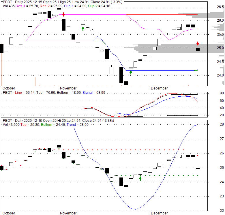 Price has closed below its short-term moving average. Short-term moving average is currently below mid-term; and below long-term moving average. From the relationship between price and moving averages: This stock is NEUTRAL in short-term; and NEUTRAL in mid-long term.[ PBOT ] has closed above bottom band by 37.2%. Bollinger Bands are 0% narrower than normal.