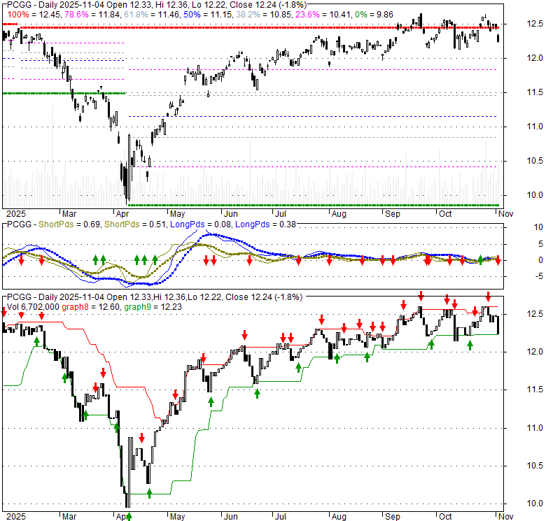 Price has closed below its short-term moving average. Short-term moving average is currently above mid-term; and above long-term moving average. From the relationship between price and moving averages: This stock is NEUTRAL in short-term; and BULLISH in mid-long term.[ PCGG ] has closed above bottom band by 15.9%. Bollinger Bands are 6.5% wider than normal. The current width of the bands does not suggest anything about the future direction or movement of prices.