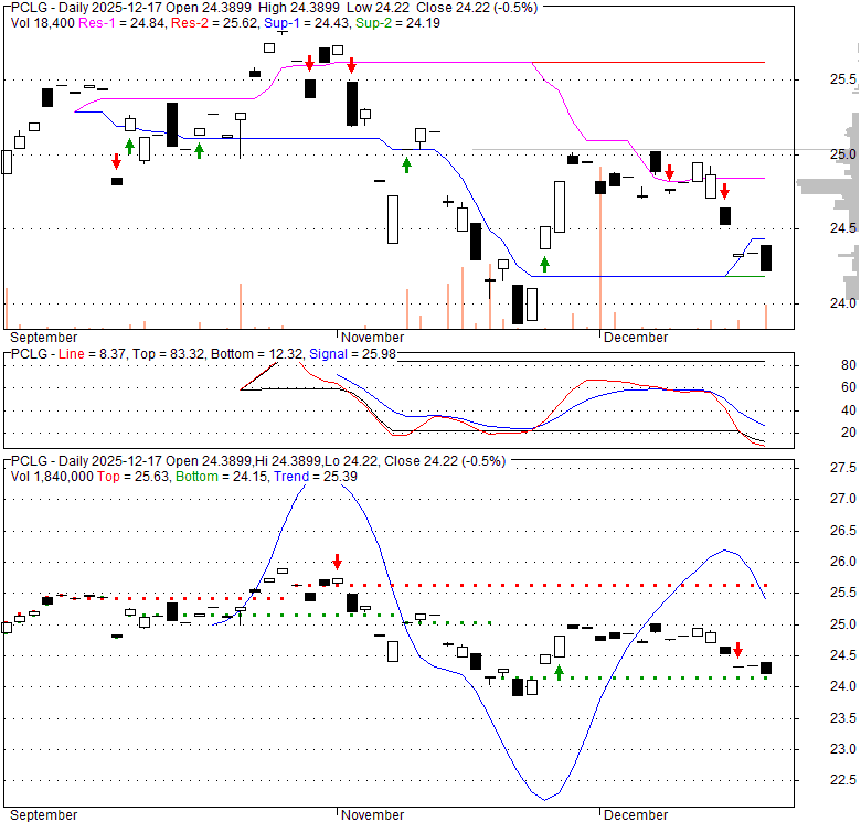 Price has closed below its short-term moving average. Short-term moving average is currently below mid-term; and below long-term moving average. From the relationship between price and moving averages: This stock is BEARISH in short-term; and NEUTRAL in mid-long term.[ PCLG ] has closed below the lower bollinger band by 3.3%. Bollinger Bands are 0% narrower than normal.