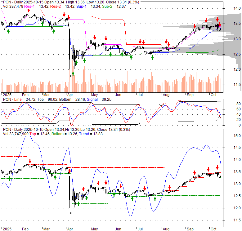 Price has closed below its short-term moving average. Short-term moving average is currently above mid-term; and above long-term moving average. From the relationship between price and moving averages: This stock is NEUTRAL in short-term; and BULLISH in mid-long term.[ PCN ] has closed above bottom band by 17.3%. Bollinger Bands are 40.8% narrower than normal. The narrow width of the bands suggests low volatility as compared to its normal range. The bands have been in this narrow range for 8 bars. This is a sign that the market may be about to initiate a new trend.