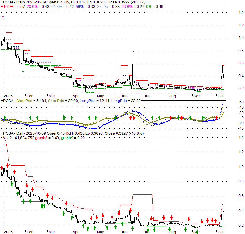 Price has closed above its short-term moving average. Short-term moving average is currently above mid-term; and above long-term moving average. From the relationship between price and moving averages: This stock is BULLISH in short-term; and NEUTRAL in mid-long term.[ PCSA ] has closed below upper band by 8.0%. Bollinger Bands are 282.5% wider than normal. The large width of the bands suggest high volatility as compared to its normal range. The bands have been in this wide range for 2 days. This is a sign that the current trend might continue.