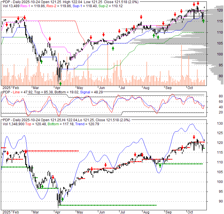 Price has closed above its short-term moving average. Short-term moving average is currently above mid-term; and above long-term moving average. From the relationship between price and moving averages: This stock is BULLISH in short-term; and BULLISH in mid-long term.[ PDP ] has closed below upper band by 12.0%. Bollinger Bands are 16.7% wider than normal. The current width of the bands does not suggest anything about the future direction or movement of prices.